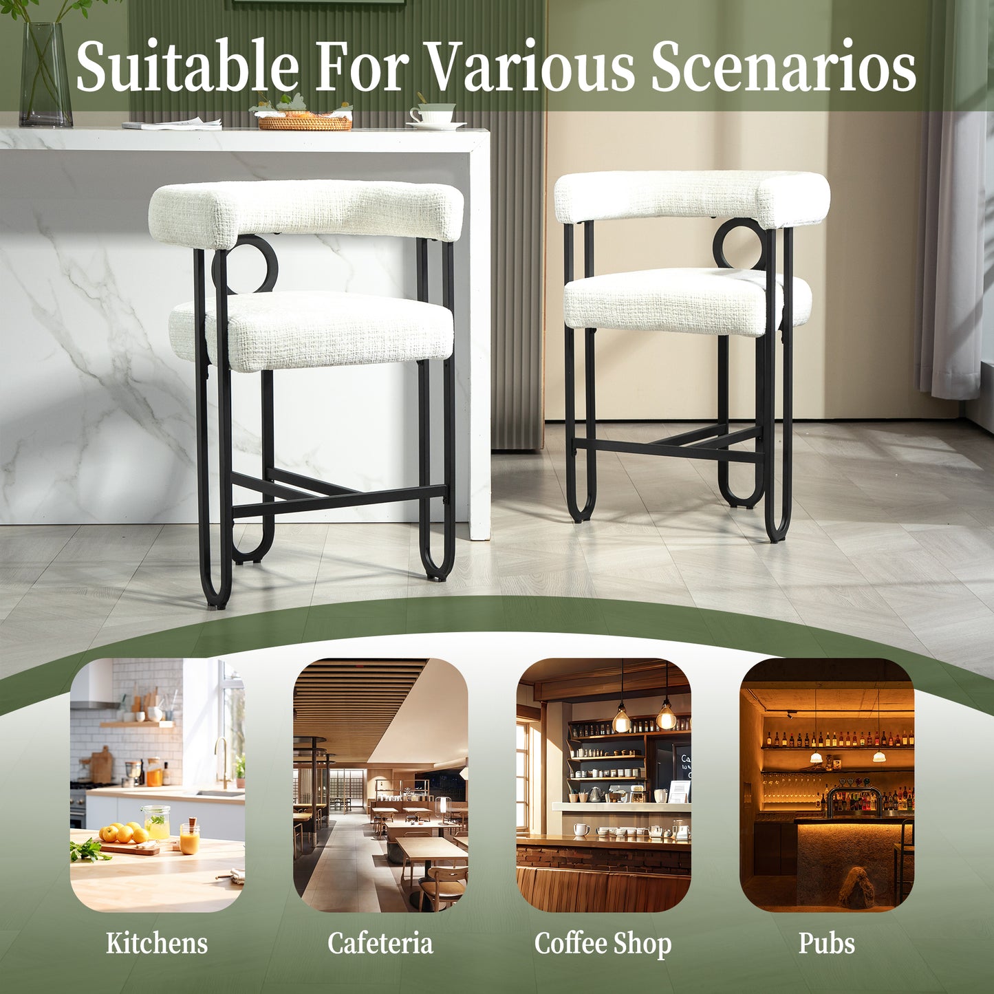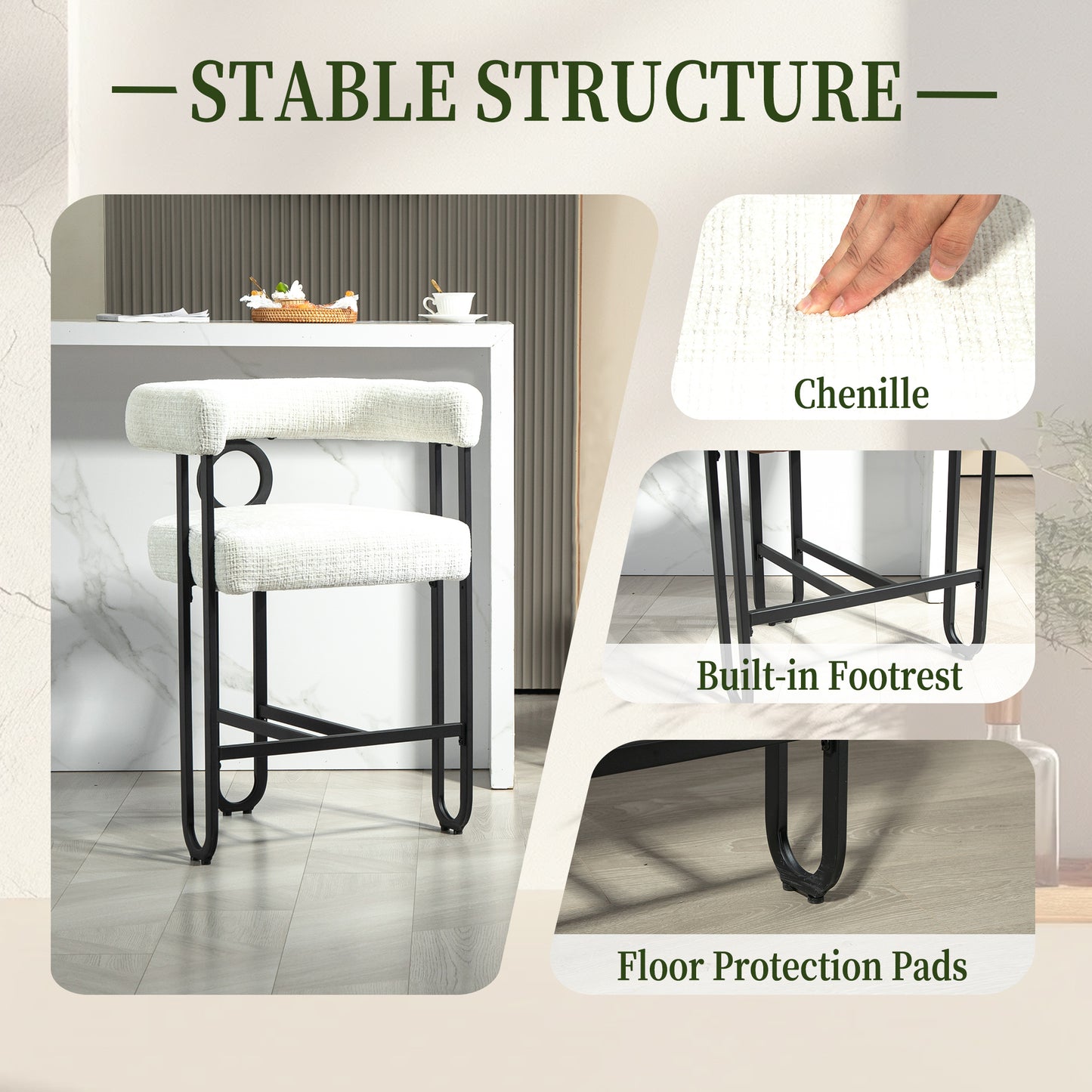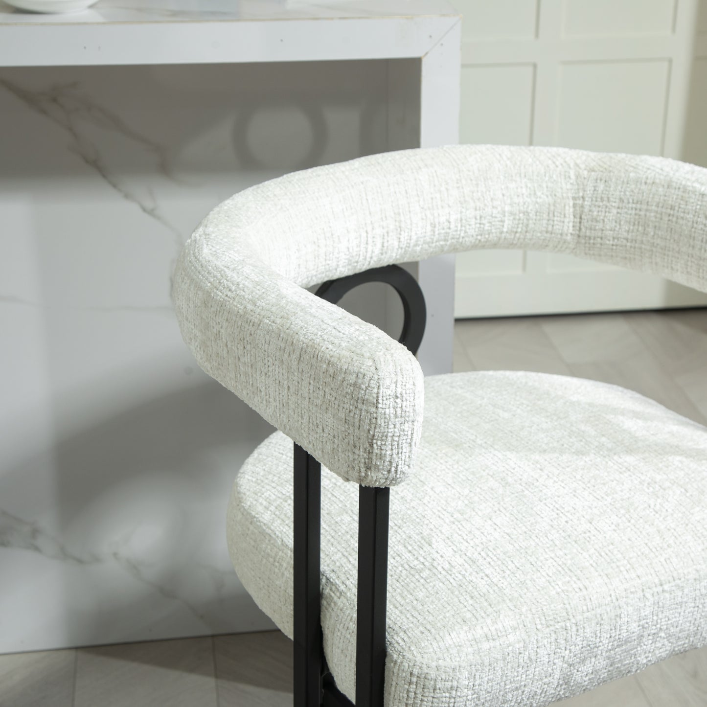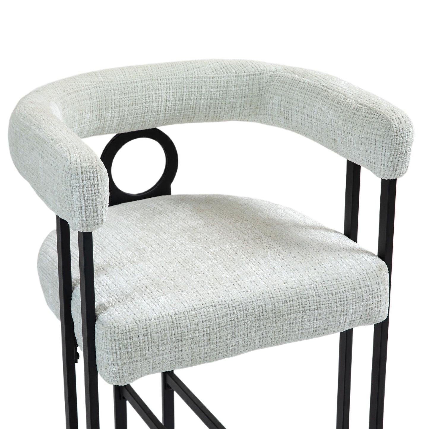 Give a nice look to your Space with Marcellus Modern Bar Stools Crafted to bring style and comfort to your home, the Marcellus Modern Bar Stool is designed for those who appreciate elegant simplicity. The sleek black metal frame perfectly complements the luxurious beige chenille upholstery, offering a touch of modern sophistication. With its beautifully curved backrest, this bar stool ensures both support and comfort, making it ideal for your kitchen island, bar, or dining space.