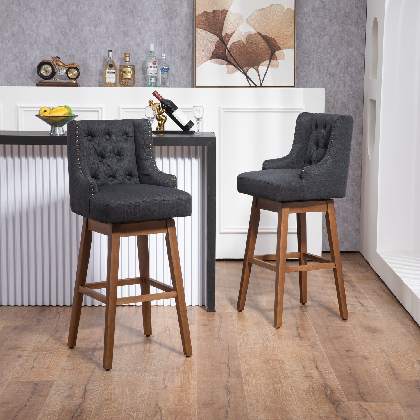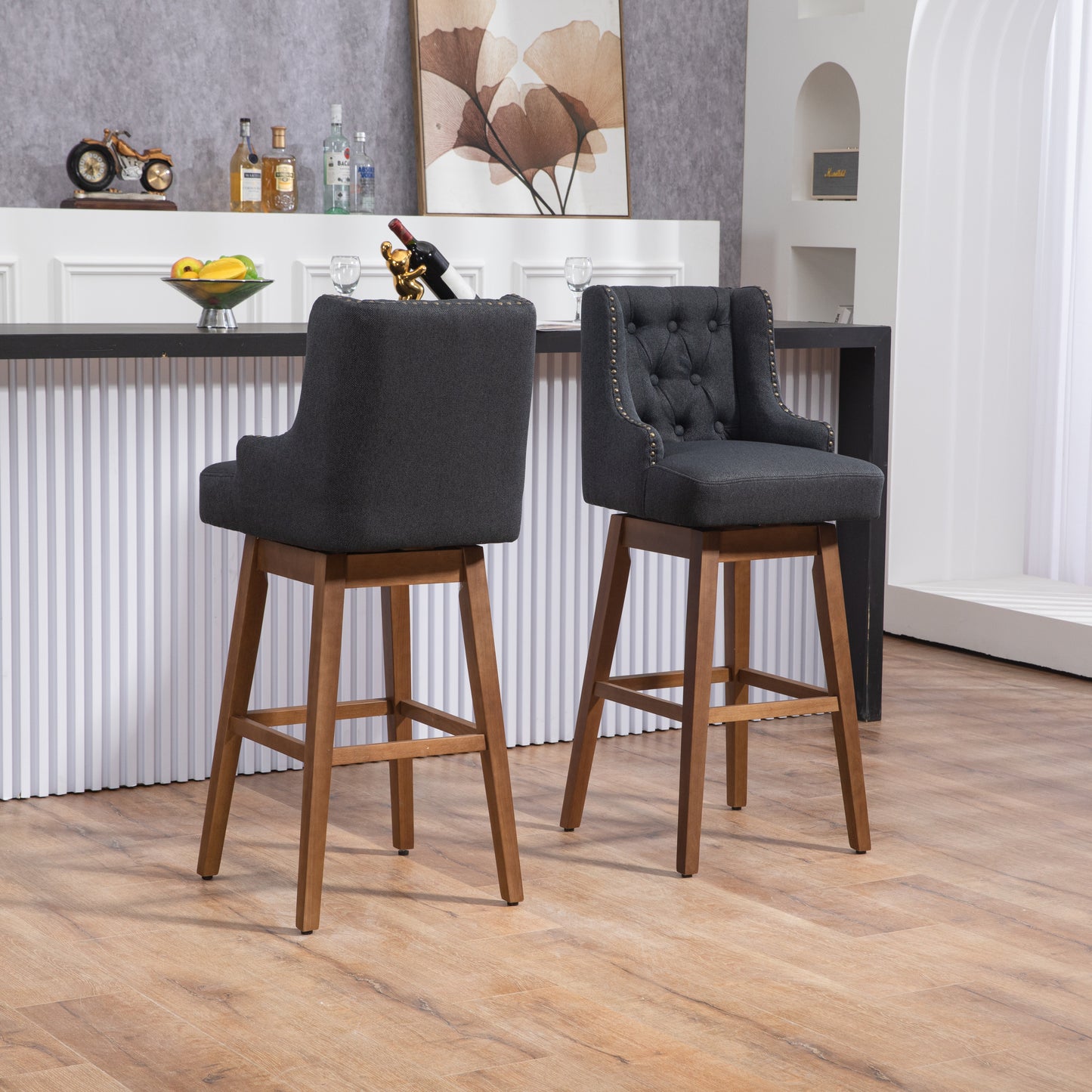 Helvion - Set of 2 - 29.92" Black Linen Swivel Counter Height Bar Stools with Solid Wood Legs and High Back