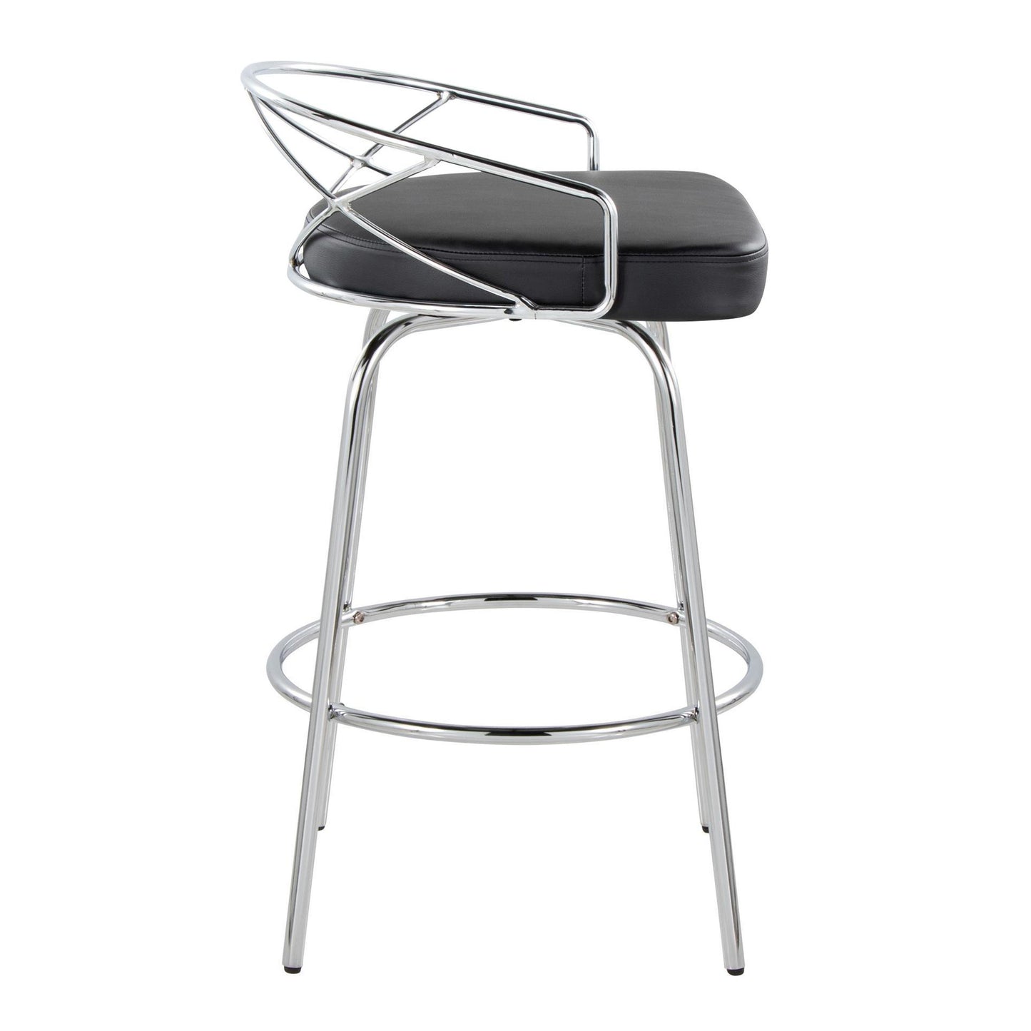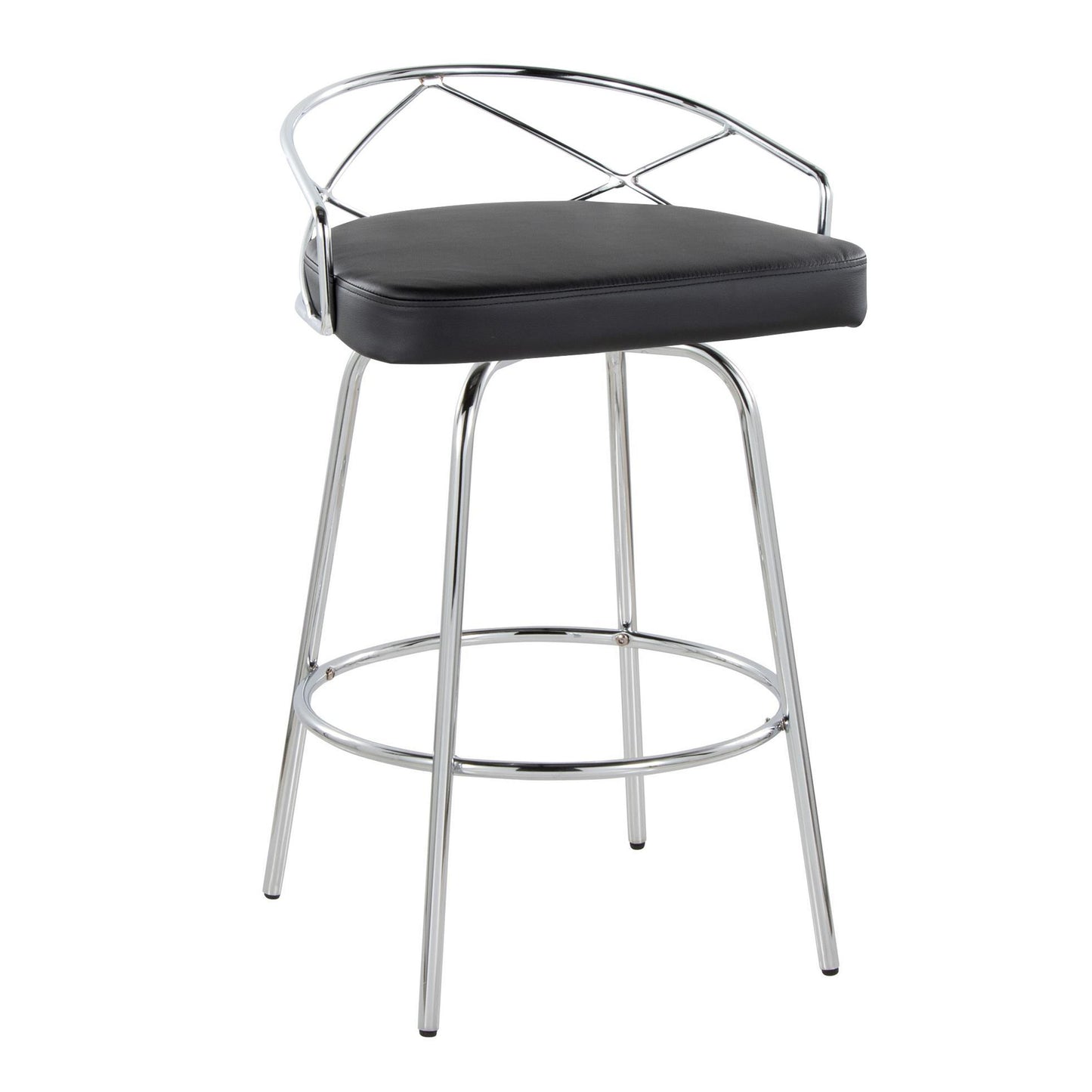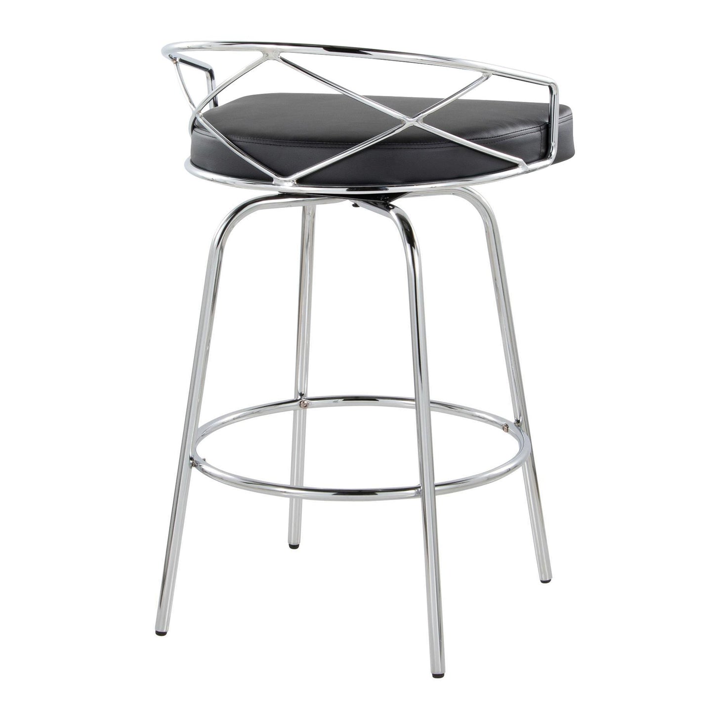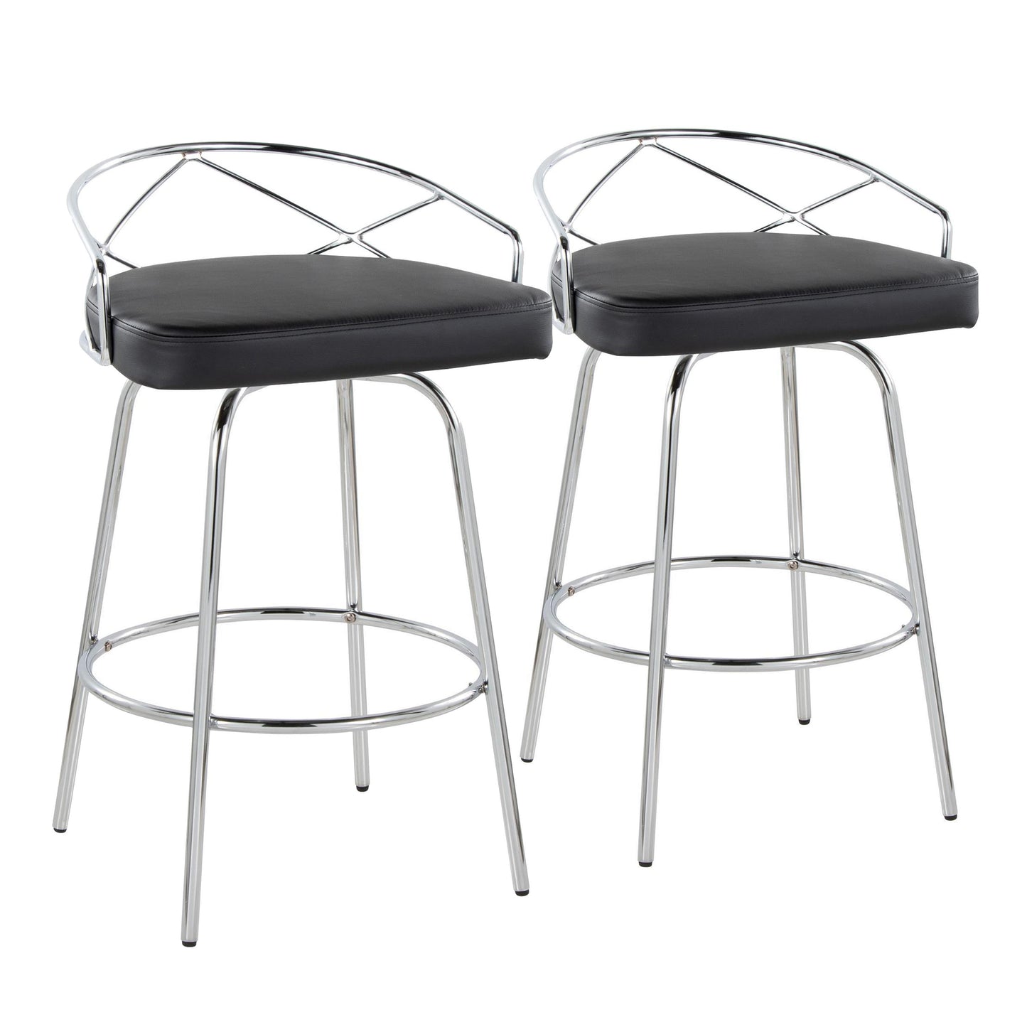 Flourish your dining experience with the Eulalia- Set of 2 - 26" Fixed-Height Swivel Counter Stools. This pair of stunning stools is designed to bring both style and functionality into your home. Featuring sleek chrome metal legs, black faux leather upholstery, and a 360-degree swivel, they offer both comfort and versatility. With a round footrest and a rounded backrest, these stools ensure maximum support and style, making them a perfect fit for any modern or glam-inspired space.