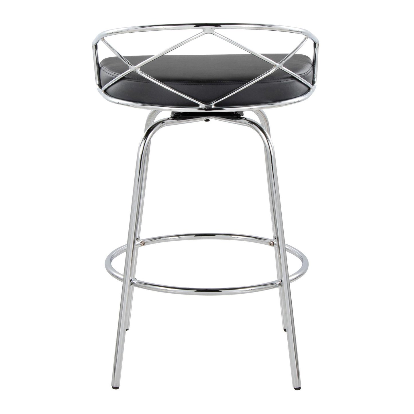 Eulalia - Set of 2 - 26" Fixed-Height Swivel Counter Stools in Chrome and Black Faux Leather with Round Footrest – Luxe Art Deco Design