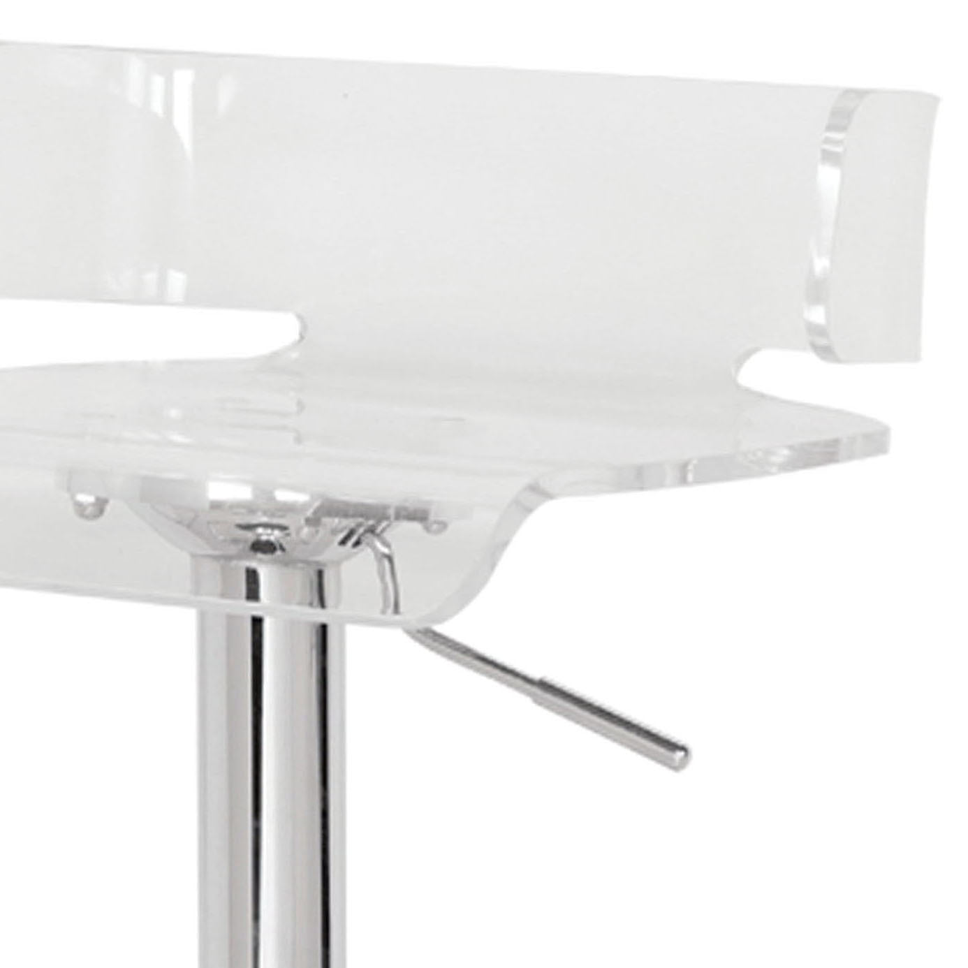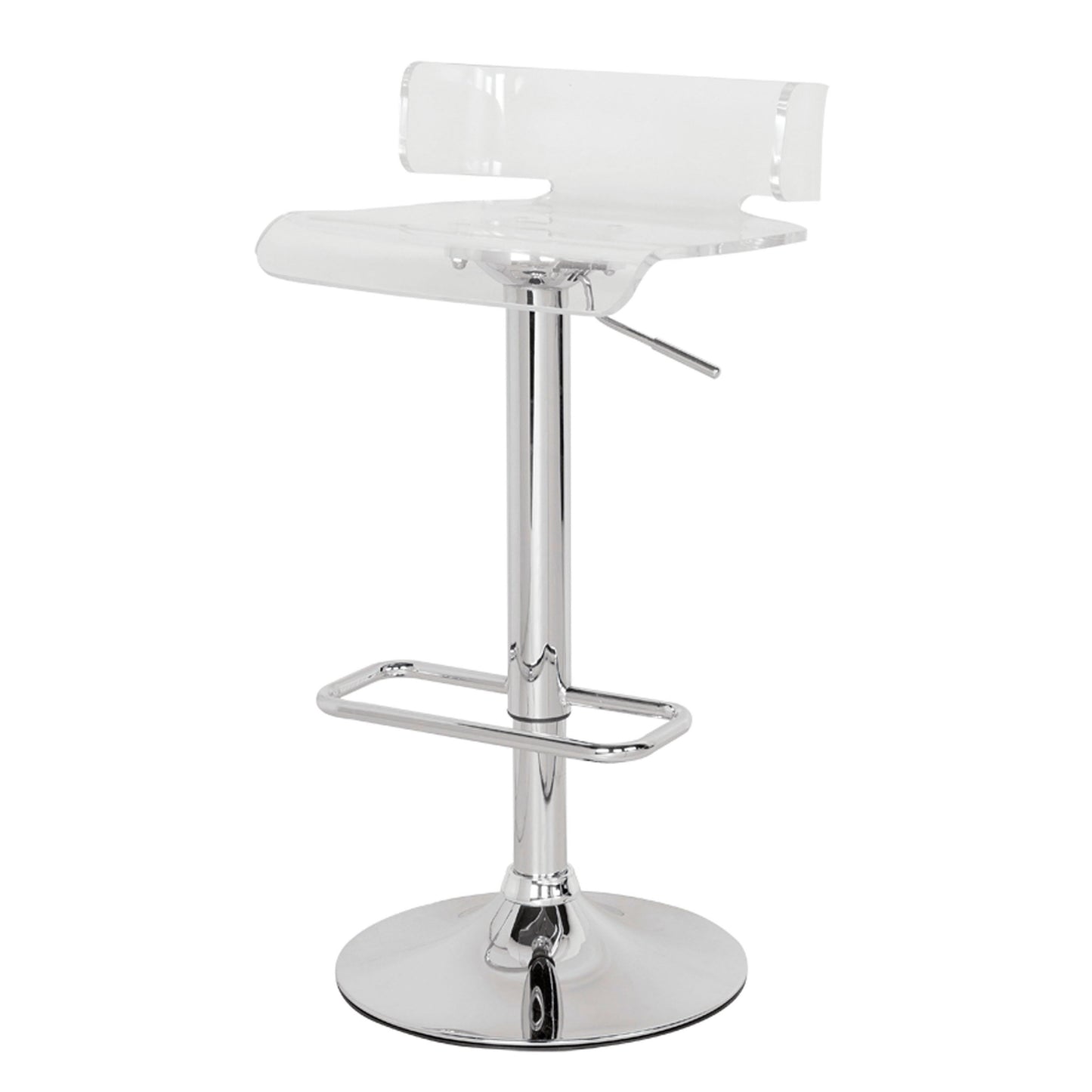 Meldrum Adjustable Swivel Bar Stool, where modern style meets practical functionality. Designed for versatile use, this stool features a transparent acrylic seat and a sleek, low-profile backrest that add a touch of sophistication to any bar or counter area. With a full 360° swivel, it allows for easy movement, making it ideal for social settings, while the gas-lift mechanism enables adjustable height to fit any seating arrangement. The sturdy chrome base provides durability, while a built-in footrest offers added comfort.