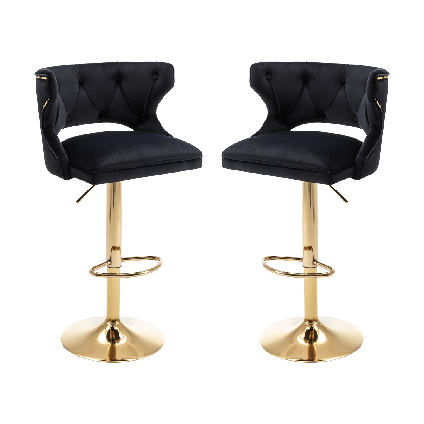 Virtell - Set of 2 -26" Velvet Black Counter Height Bar Stools with Back & Footrest – Adjustable Seat, Swivel Design, Gold Chrome Base
