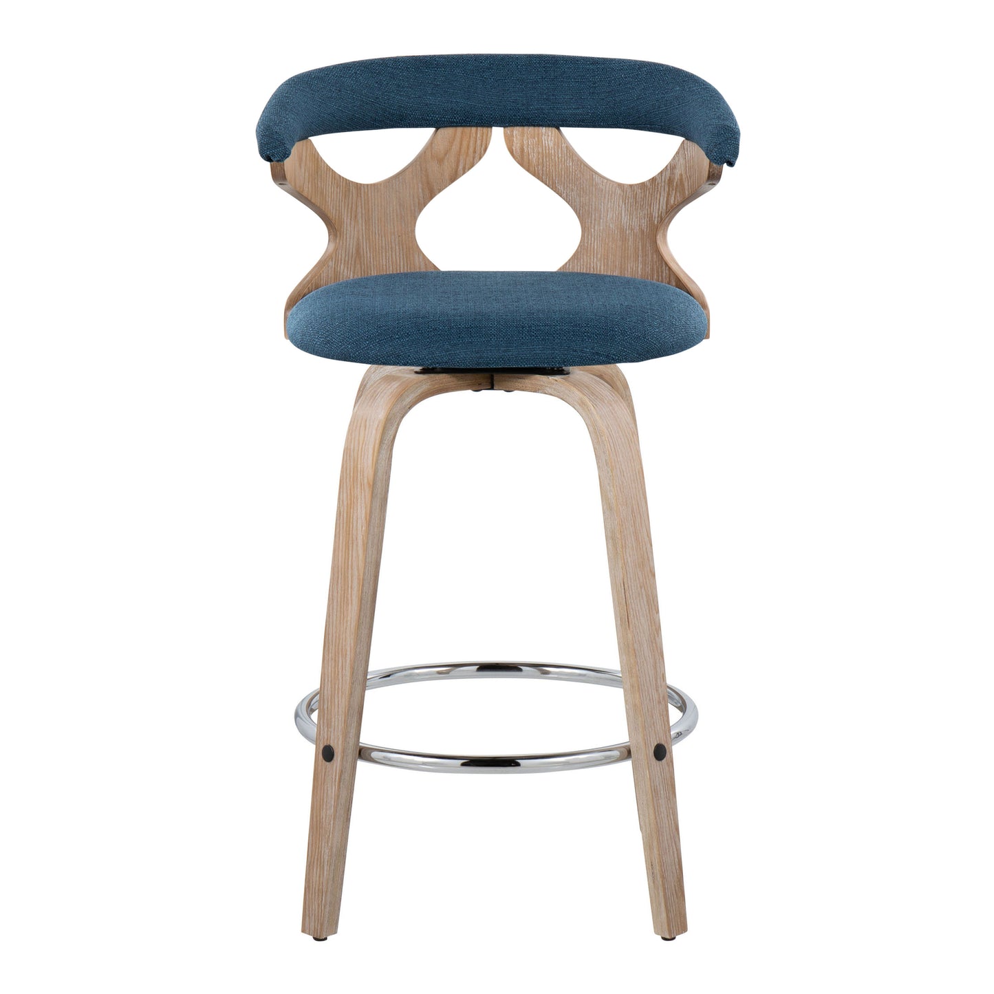 View compareGardenia - Set of 2 - 26" Fixed-Height Counter Stools with 360° Swivel in White-Washed Wood and Blue Fabric, Chrome Metal Footrest
