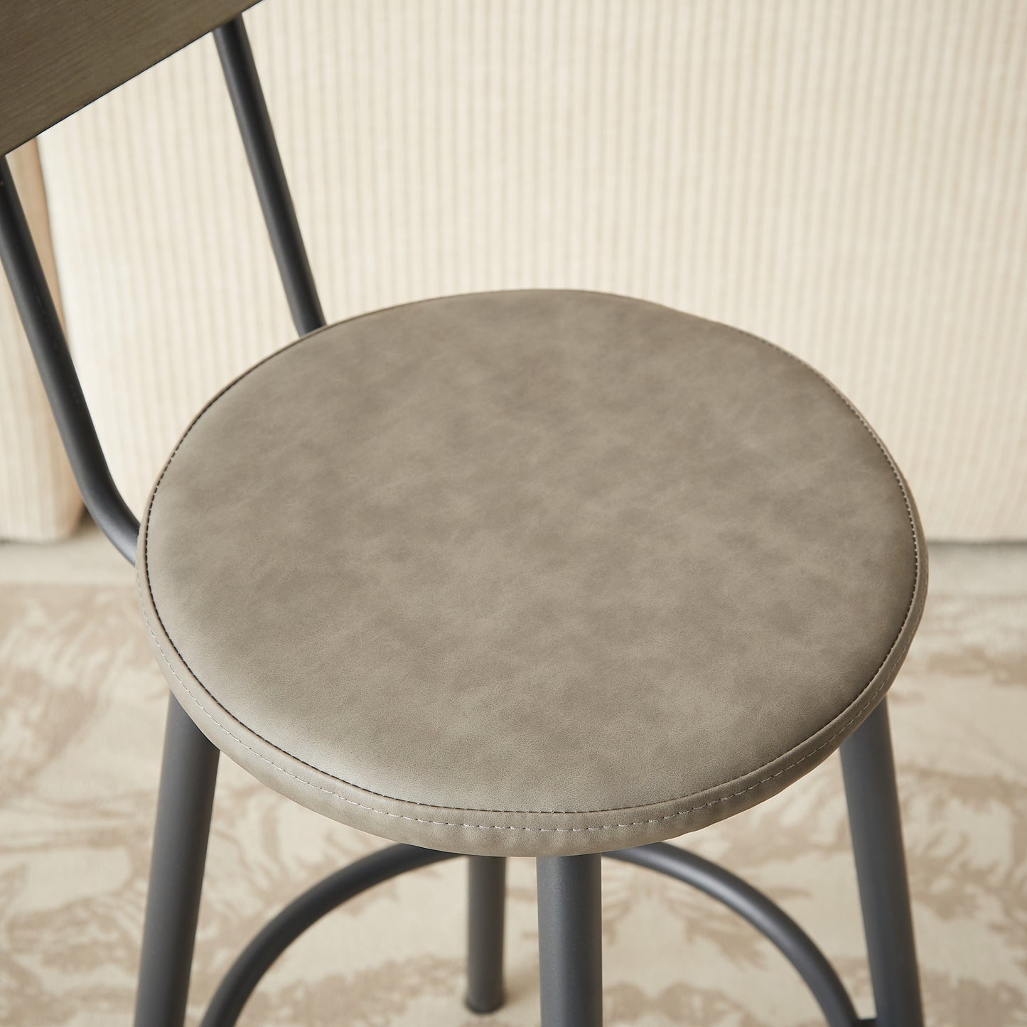 The durable particle board tabletop features a rustic gray finish, while the black steel frame ensures long-lasting stability. Reinforced bottom beams and adjustable foot pads guarantee a wobble-free experience, even on uneven floors. The stools are crafted for comfort with padded cushions and backrests, providing a stylish yet functional seating solution.