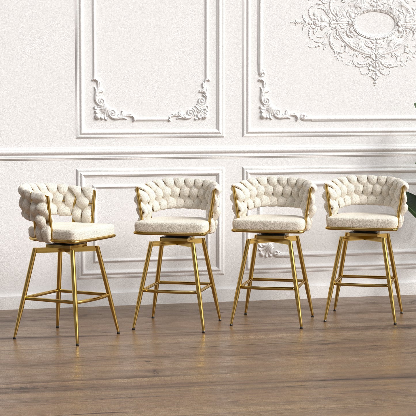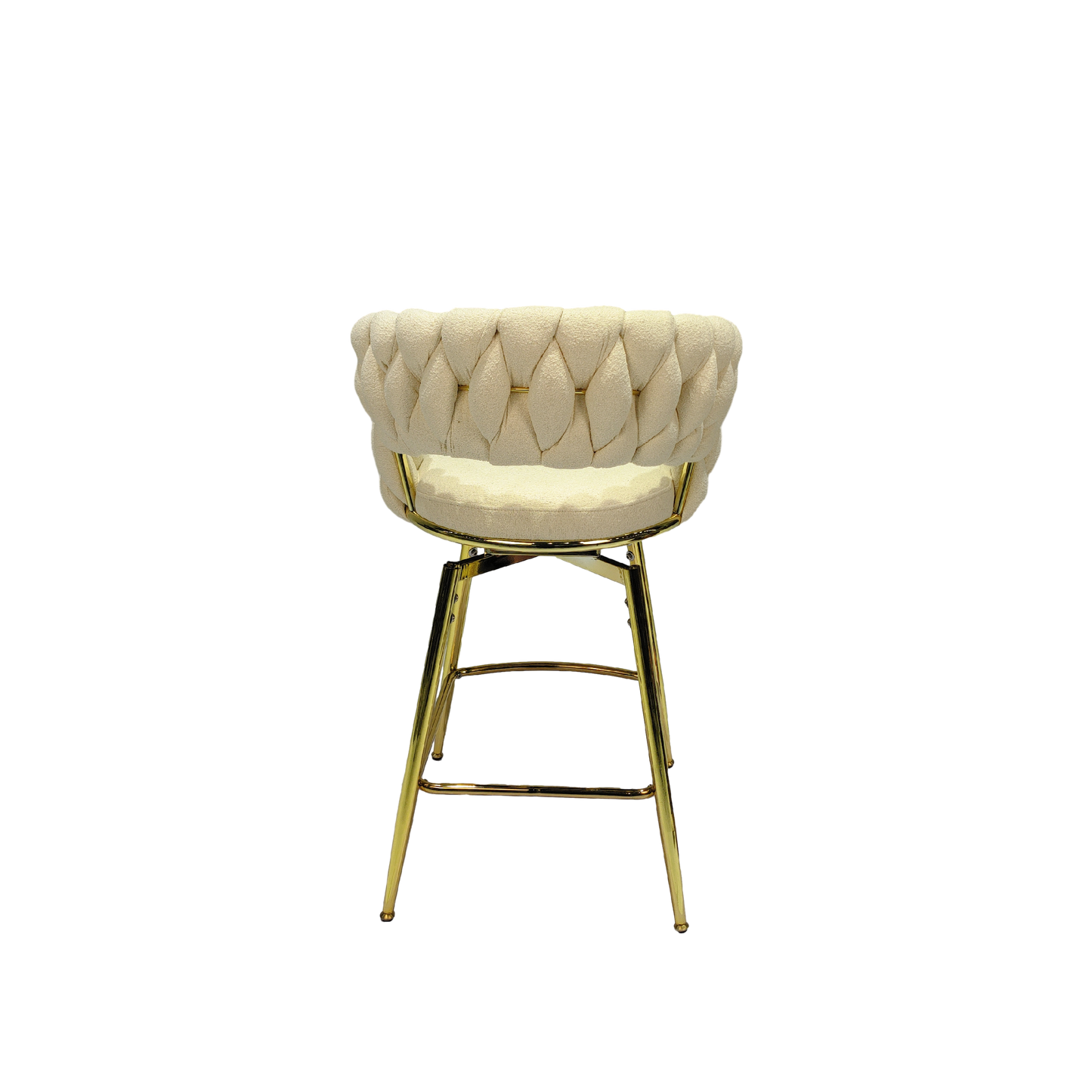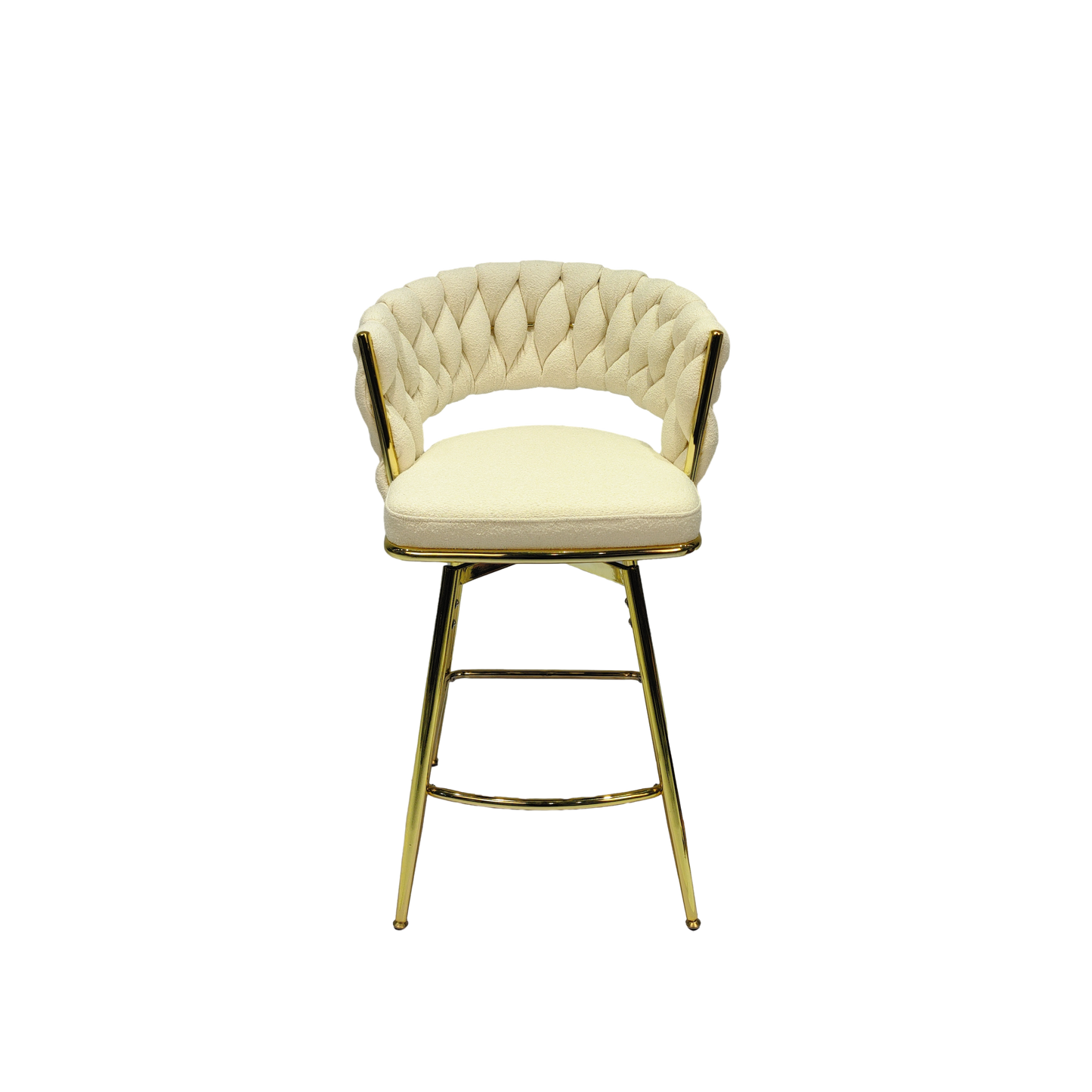 Transform your space with the lyros Haven White Woven Bar Stools, designed to elevate both style and comfort. These stools feature a sleek gold metal base paired with a unique woven toweling fabric, offering a blend of modern luxury and timeless functionality. Whether you're hosting friends or enjoying a quiet evening, their 360-degree swivel design and plush cushioning ensure a premium seating experience. Perfect for kitchen islands, bars, or dining spaces, these versatile stools add sophistication to any setting.